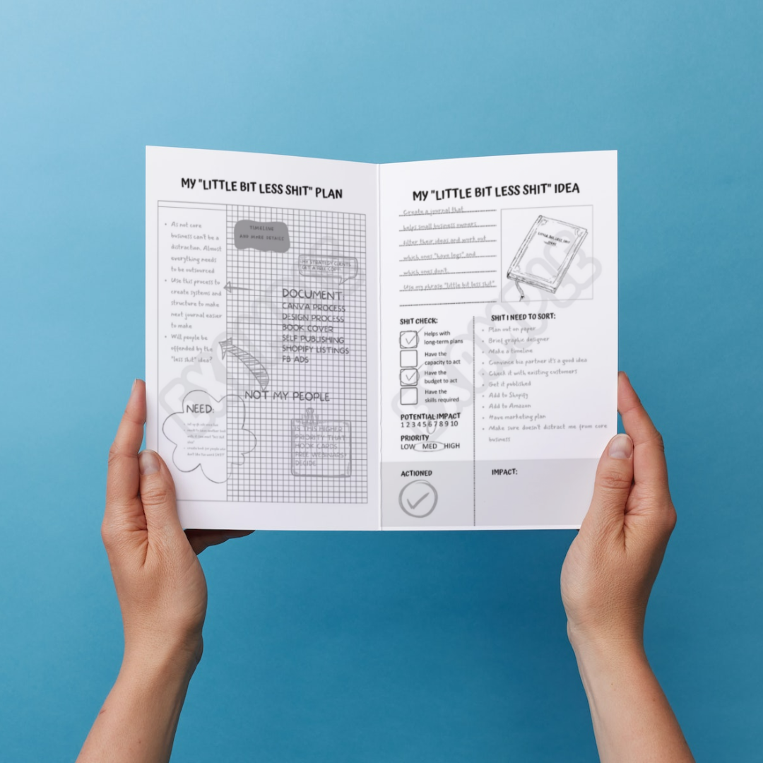 My "Little Bit Less Sh&t" Ideas Journal is the perfect tool for small business owners! Prioritise your ideas and keep track of all your big and little ones while improving your business bit by bit-no sense checking required! With tons of ideas to grow, plan and perfect your business, this journal will be your very own motivator. So why not get the ball rolling and make your ideas a reality?